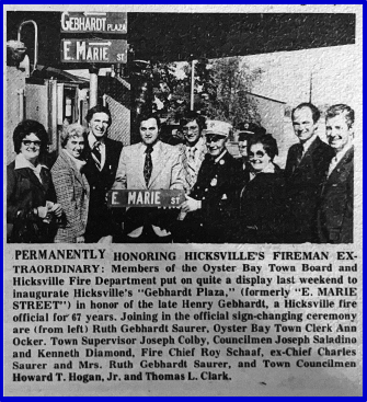 For a time, Chief Gebhardt lived on the 3rd floor of the Fire House on East Marie Street and held the duties of emergency dispatcher and firehouse man. On October 22, 1977, the portion of East Marie Street between Broadway and the LIRR was re-named in honor of the late Hicksville ex-chief Henry Gebhardt. It is the first time a street in Nassau County was named in honor of a person-a volunteer of any type. TOB Supervisor Joseph Colby presented the family of Henry A. Gebhardt a proclamation to proclaim October 22, 1977, Henry A. Gebhardt Day. The proclamation stated “Hicksville will forever be the beneficiaries of the skills he directed to assure our residents a conscientious and vigilant volunteer Fire Department. It was a day that was dedicated in respect for a man whose esteem shall stand forever as his own living memorial. Ex-Chief Owen Magee said “Into every lifetime, at least once, a man appears whom you not only respect, admire and revere, but honor as a person of integrity and as someone you really relate to. Normally this is a national hero, an athlete, or a star of major magnitude. Seldom do you find such a man in a comparatively small group that is so honored by all who know him. That is the case, however, in the Hicksville Fire Department. Henry Gebhardt, Ex-Captain, Ex-Chief, Counselor, Advisor, Confessor, Confidant and Friend is just such a man. "Gebby", as he is affectionately known, does not simply belong to one HFD Company, but to the whole of the Department and has become a legend in his own time. In the image of Don Quixote, Walter Raleigh, The Lone Ranger, and the U.S. Calvary of old, "Gebby' is always there when you need him most, inspiring, directing, giving you the benefit of not only his firematic experience but his personal contact with life itself.”