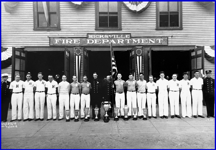 In 1931, the firemen went to Saranac Lake, New York to participate in the Annual New York State Firemen’s Tournament. When the day ended, the “Hicks” captured eight 1st Place trophies securing the title as Champions. This would never happen again even to this day. Those members were Chief John Puvogel, Team Captain, John Jeanson, Joseph and Gerald Braun, John Werthessen Jr., John Werthessen Sr., Louis Fricke, Arnold Jeanson, John Miller, William Braun, Otto Jeanson, Harold Hauxhurst, Richard Kershow, Harry Borley, Edmund Neder, Valentine Kerbs, William Geyer, Vincent Stolz and William Cisler. The silver cups have been on display at Station 1 on the 2nd floor showcases since they were brought home.