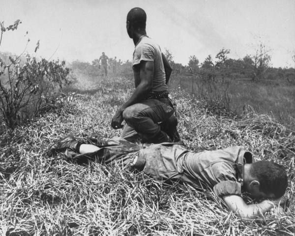 War And Conflict -- Vietnam War: Young American lieutenant, his leg burned by exploding Viet Cong white phosphorus booby trap, lying on ground while being treated by medic, during Vietnam War, 1966.